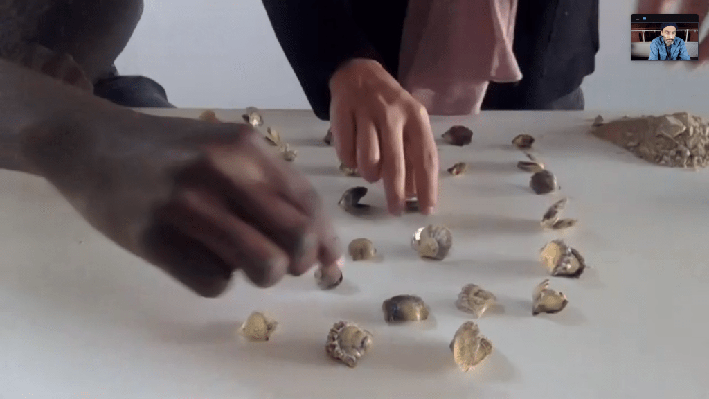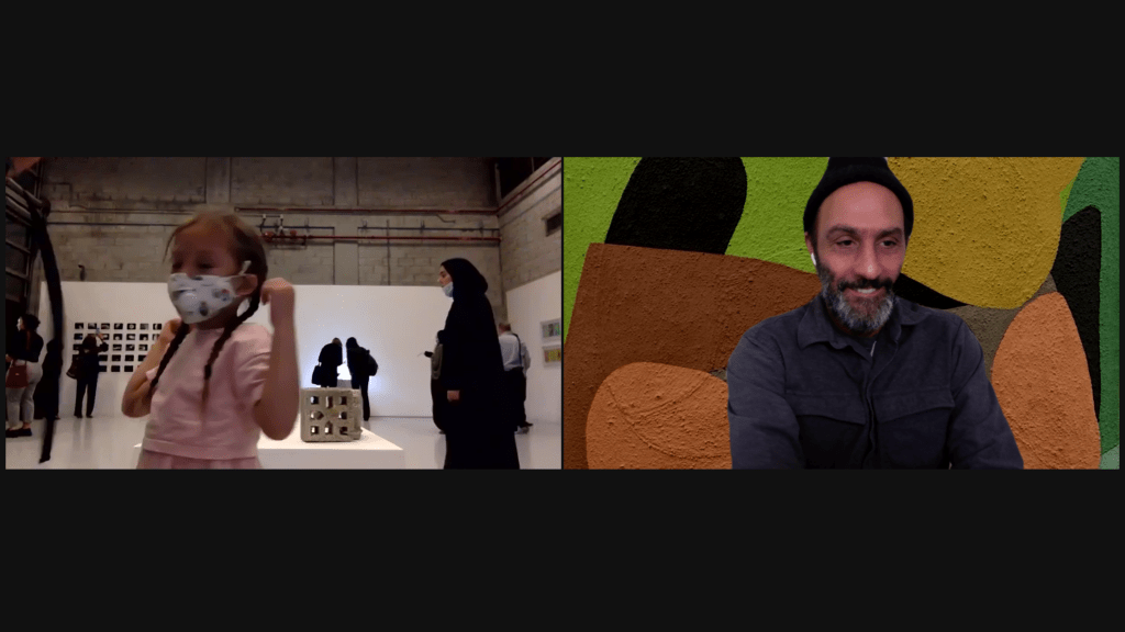 Installation, zooming in to the opening during Covid remote semester, Ted and Salma helping set up!