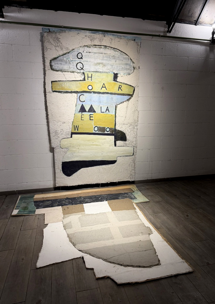 Rondo Palimpsest, acrylic, oil, sand, gravel and cement on canvas and burlap, 70 x 45 inches
